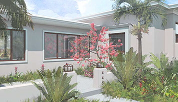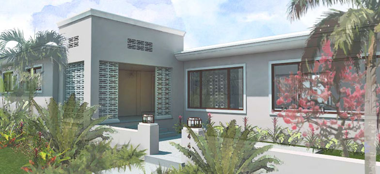 Existing horizontal planes complemented by new vertical volumes, combining to generate a landscape backdrop for the front garden and the pool deck. The new Master Suite projects forward on the east side of property with a broad overhang to shade its tall walls. Its roof projects further still to receive the projected window seat and balcony volumes which help maintain privacy. Towards the garden it extends once again to provide a work station with a view onto the garden. The front door is discovered by way of the new forecourt, and so the visitor follows and undulating path into the side of the new front porch, with a concrete breeze block that is parted to pull guests in. Once inside, an open plan stretches through the public areas of the house including a new open kitchen and family room, both of which open wide sliding glass doors onto a large new open-air back porch. There, at the threshold between inside and outside, widened for simultaneous outdoor living and dining, the tropical landscape remains unobstructed.